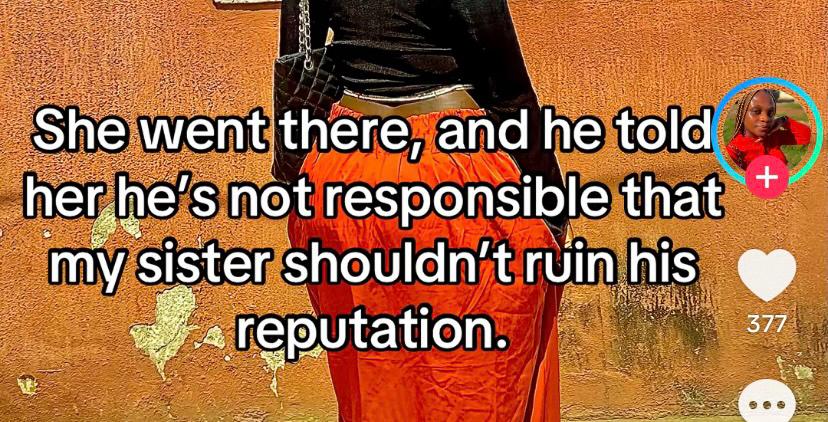 I told her to go ahead and tell him and what he says would determine. She went there and he told her that he’s not responsible, that my sister shouldn’t ruin his reputation.