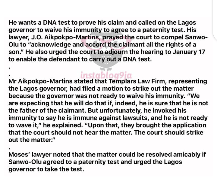 A 27-year-old young man identified as Emmanuel Moses has brought up a case in court alleging that Governor Babajide Sanwo-Olu is his father.