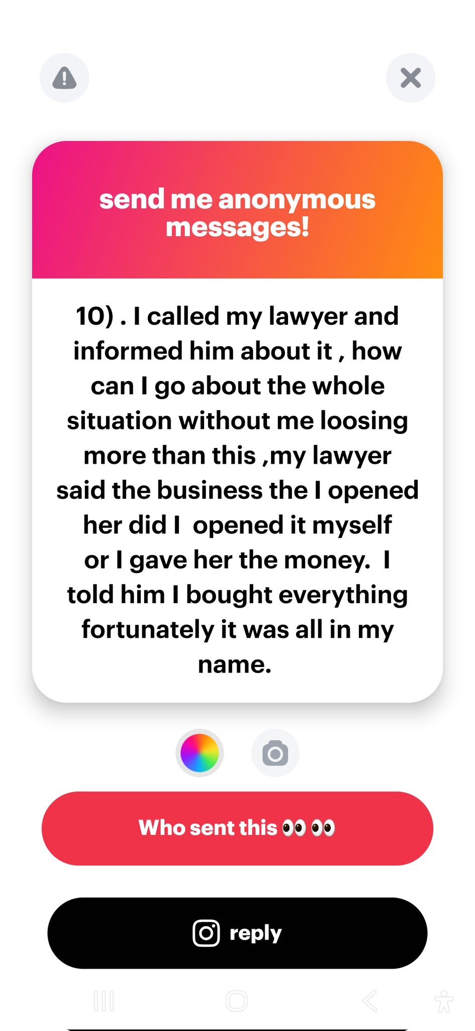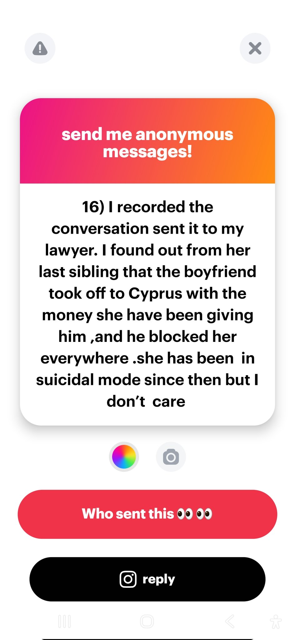 I recorded the conversation sent it to my lawyer. I found out from her last sibling that the boyfriend took off to Cyprus with the money she have been giving him ,and he blocked her everywhere .she has been in suicidal mode since then but I don’t care