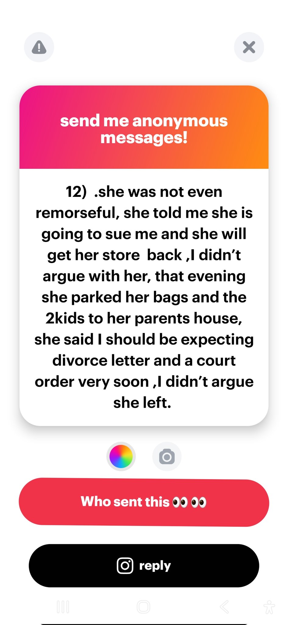 she told me she is going to sue me and she will get her store back ,| didn’t argue with her, that evening she parked her bags and the 2kids to her parents house, she said I should be expecting divorce letter and a court order very soon ,| didn’t argue she left.