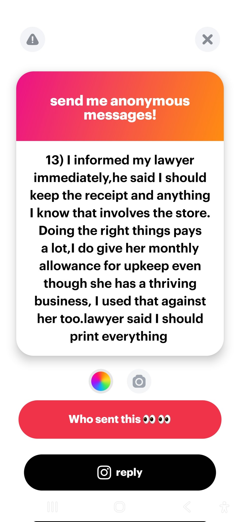 I informed my lawyer immediately,he said I should keep the receipt and anything I know that involves the store. Doing the right things pays a lot,I do give her monthly allowance for upkeep even though she has a thriving business, I used that against her too.lawyer said I should print everything