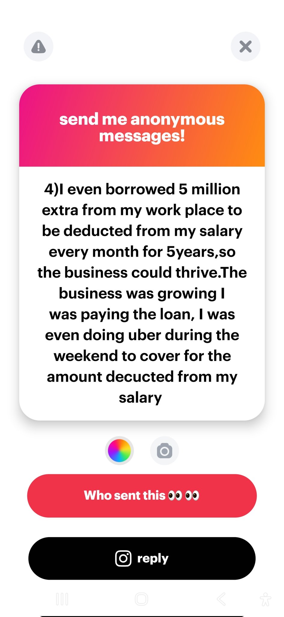 I even borrowed 5 million extra from my work place to be deducted from my salary every month for 5years,so the business could thrive.The business was growing I was paying the loan, I was even doing uber during the weekend to cover for the amount decucted from my salary