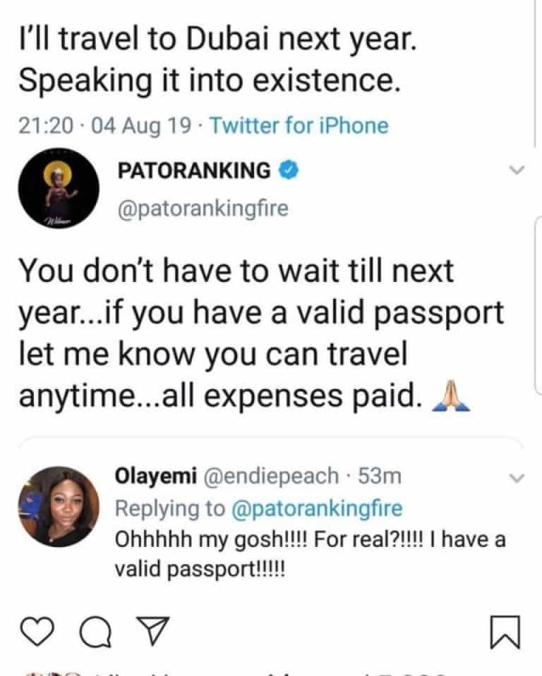 The user tweeted “I’ll travel to Dubai next year. Speaking into existence.” on August 4. However, Patoranking responded to the tweet today and assured the lady of an all-expense paid trip to Dubai if she has a visa.