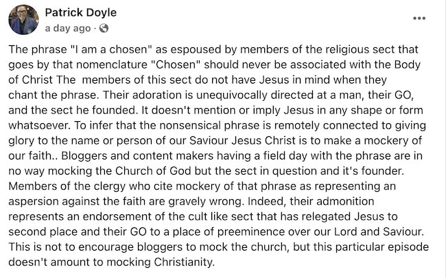 Patrick Doyle condemns Lord’s Chosen Church’s phrase as misguided worship