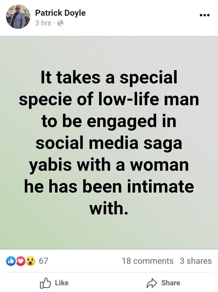 “It takes a special specie of low-life man to be engaged in social media saga yabis with a woman he has been intimate with,” he wrote.
