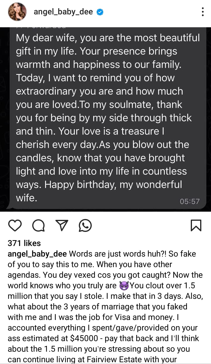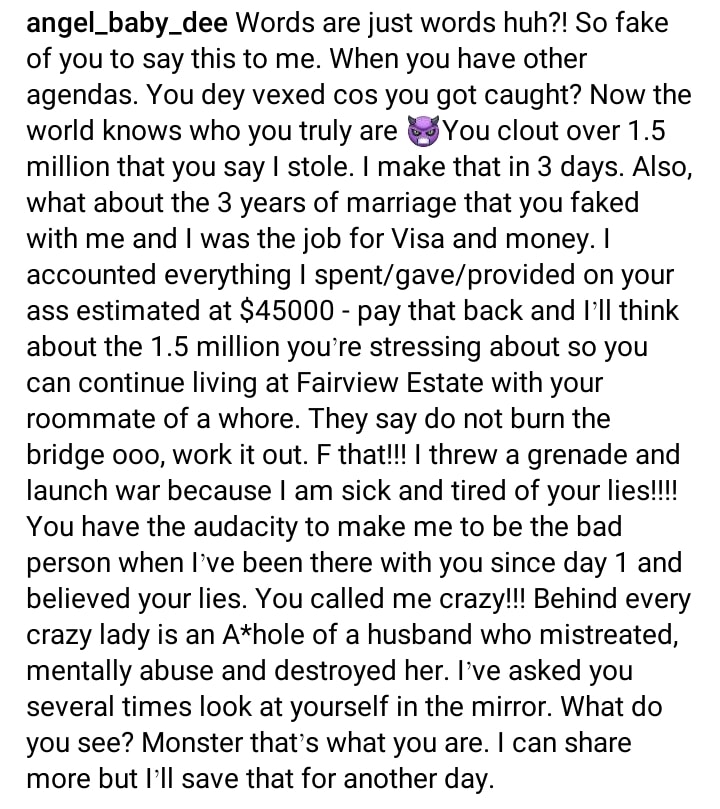 “Words are just words huh?! So fake of you to say this to me. When you have other agendas. You dey vexed cos you got caught? Now the world knows who you truly are You clout over 1.5 million that you say I stole. I make that in 3 days. Also, what about the 3 years of marriage that you faked with me and I was the job for Visa and money. I accounted everything I spent/gave/provided on your ass estimated at $45000 – pay that back and I’ll think about the 1.5 million you’re stressing about so you can continue living at Fairview Estate with your roommate of a whore. They say do not burn the bridge ooo, work it out. F that!!! I threw a grenade and launch war because I am sick and tired of your lies!!! You have the audacity to make me to be the bad person when I’ve been there with you since day 1 and believed your lies. You called me crazy!!! Behind every crazy lady is an A*hole of a husband who mistreated, mentally abuse and destroyed her. I’ve asked you several times look at yourself in the mirror. What do you see? Monster that’s what you are. I can share more but I’ll save that for another day.”