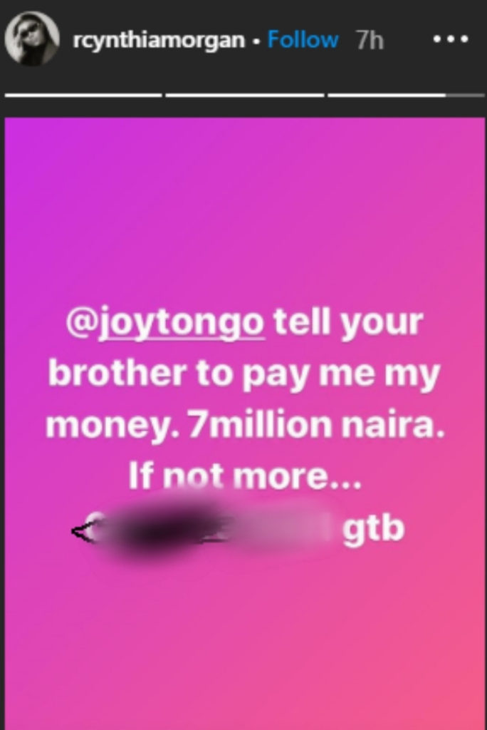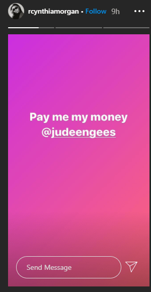 The singer in her Instastory post alleged that Jude Okoye owes her N7 million and also dragged in her former manager, Joy Tongo into the call-out post by attaching “RIP” to her photo.