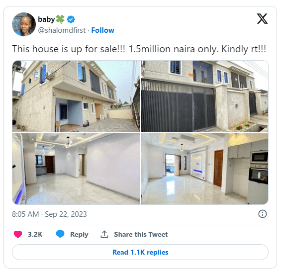 A Nigerian lady with Twitter handle @shalomdfirst, shared photos of a big house and claimed it was up for sale at the astonishingly low price of N1.5 million.