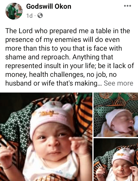 The man who bears the name, Godswill Okon on Facebook to give testimony of God’s faithfulness in his life following the birth of his first fruit.