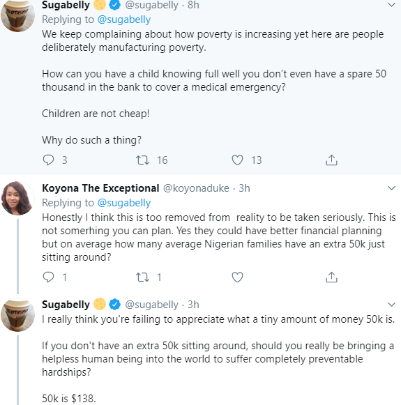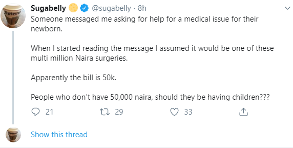 Sharing the information to Twitter, Sugabelly said: “People who don’t have 50,000 naira, should they be having children???”