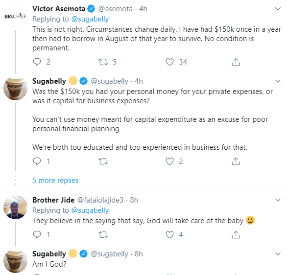 Replying, IT expert Victor Asemota said: “This is not right. Circumstances change daily. I have had $150k once in a year then had to borrow in August of that year to survive. No condition is permanent.”