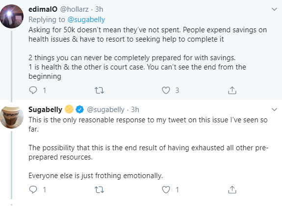 Another Twitter user replied: “Asking for 50k doesn’t mean they’ve not spent. People expend savings on health issues & have to resort to seeking help to complete it 2 things you can never be completely prepared for with savings. 1 is health & the other is court case. You can’t see the end from the beginning.”