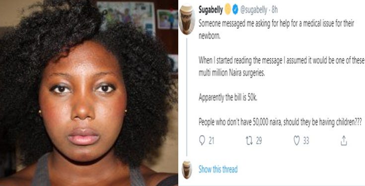 Sharing the information to Twitter, Sugabelly said: “People who don’t have 50,000 naira, should they be having children???”
