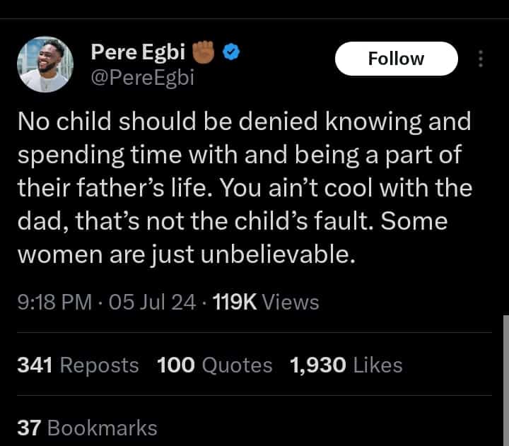 Taking to the micro-blogging platform X, Pere emphasized the importance of a father’s presence in their child’s life while condemning mothers who use their kids as weapons against their father.