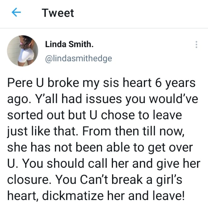 “Pere U broke my sis heart 6 years ago. Y’all had issues you would’ve sorted out but U chose to leave just like that. From then till now, she has not been able to get over U. You should call her and give her closure. You Can’t break a girl’s heart, dickmatize her and leave!”