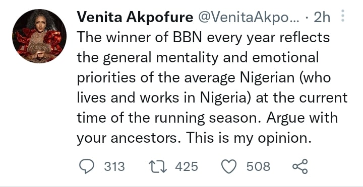 The BBNaija star took her Twitter page to opine that the winner of Big Brother Naija every year, reflects the emotional priorities of the average Nigerian at the time of the current season.