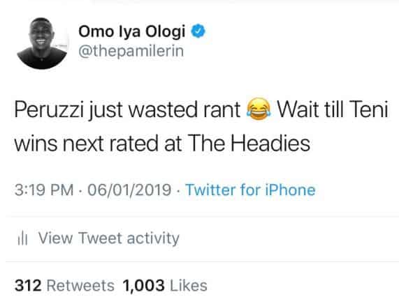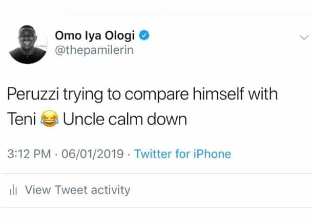 Narrating his ordeal, Pamilerin said Peruzzi reacted to some tweets he made in January where he compared him to Teni. In the series of Tweets, Pamilerin had said Teni was a better singer and would win more awards than Peruzzi.