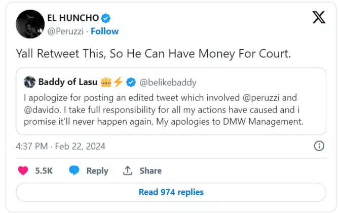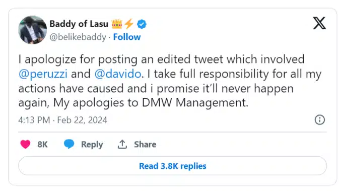 “I apologize for posting an edited tweet which involved @peruzzi and @davido. I take full responsibility for all my actions have caused, and I promise it’ll never happen again. My apologies to DMW Management,” he wrote.