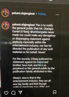 “For the records, D’banj authored no statement against his friend and brother Seun Kuti, and he is as perplexed as the general public by the publication falsely attributed to him.