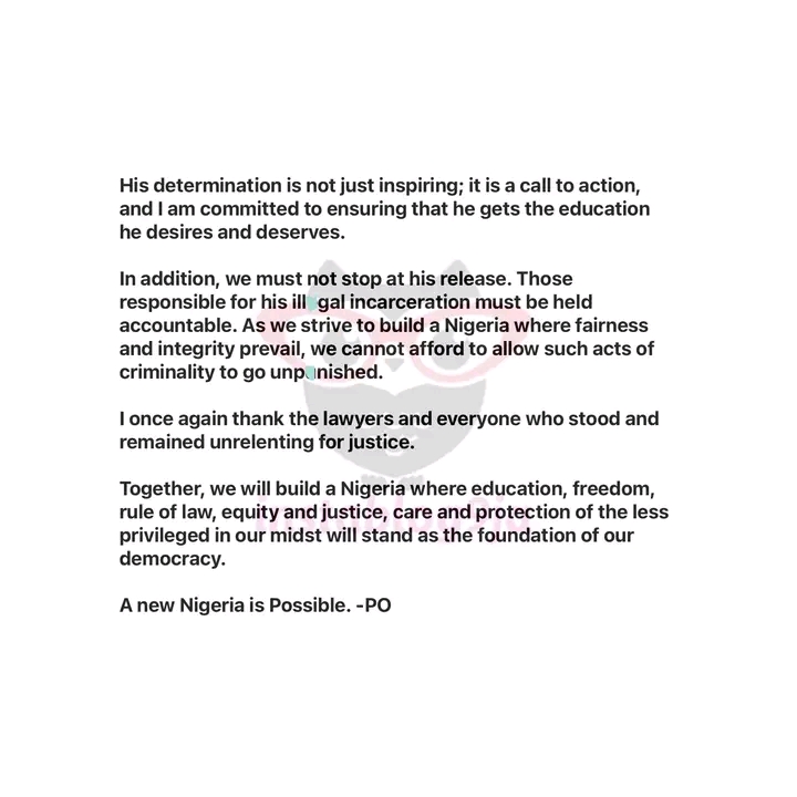 Renowned politician, Peter Obi receives widespread acclaim for scholarship offer to viral teenager, Yusuf Alabi, recently released from detention.
