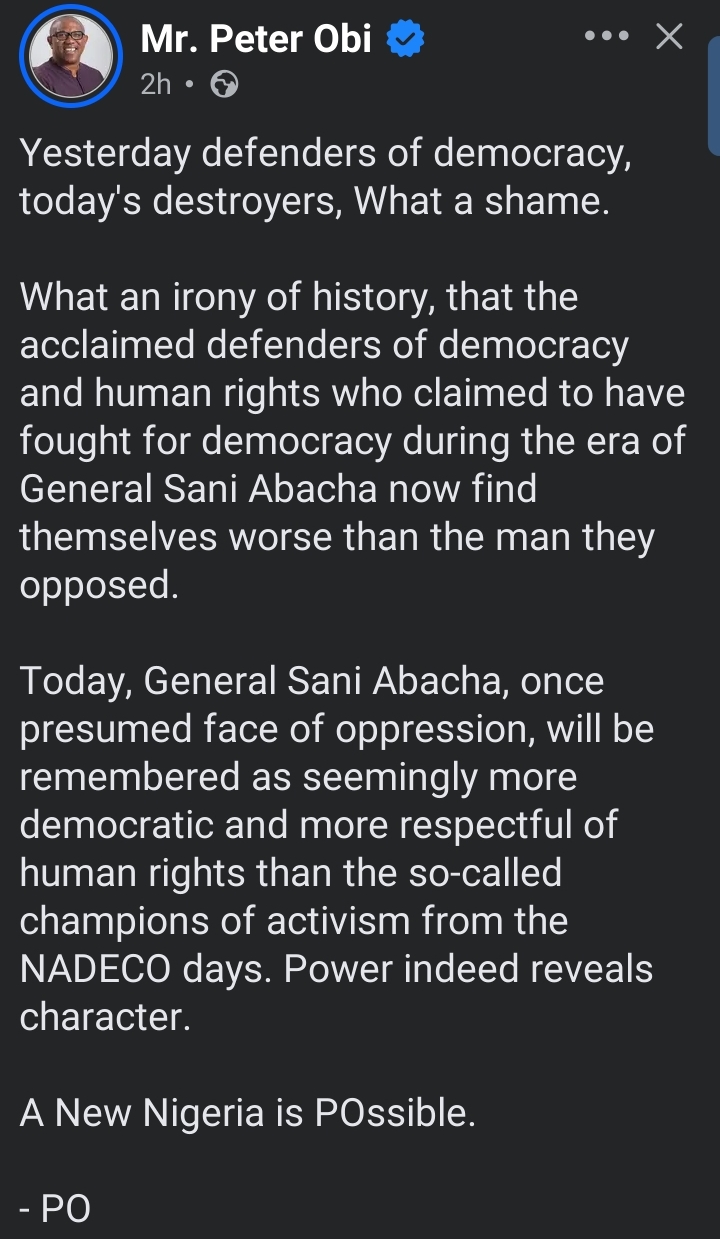 Obi further expressed concern over what he described as a decline in democratic values among some individuals who once championed human rights.