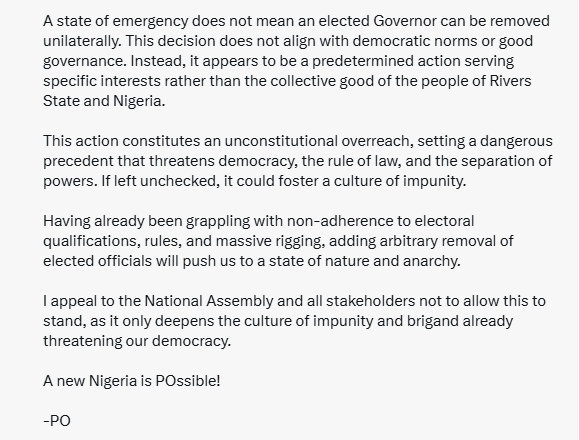 A state of emergency does not mean an elected Governor can be removed unilaterally. This decision does not align with democratic norms or good governance. Instead, it appears to be a predetermined action serving specific interests rather than the collective good of the people of Rivers State and Nigeria.