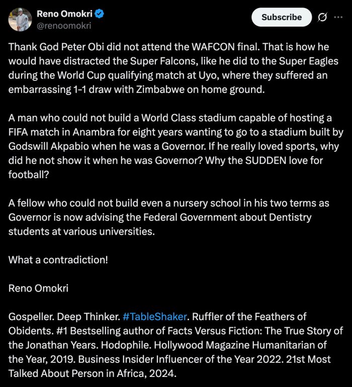 “Thank God Peter Obi did not attend the WAFCON final. That is how he would have distracted the Super Falcons, like he did to the Super Eagles during the World Cup qualifying match at Uyo,” Omokri wrote.