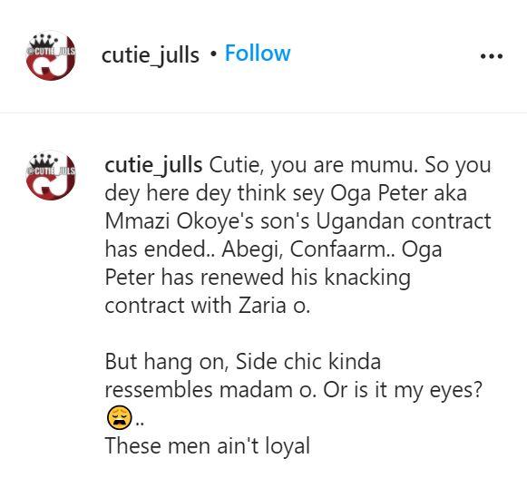“Cutie, you are mumu. So you dey here dey think sey Oga Peter aka Mmazi Okoye’s son’s Ugandan contract has ended.. Abegi, Confaarm.. Oga Peter has renewed his knacking contract with Zaria o.