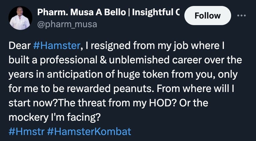 A Nigerian pharmacist, Bello Musa calls out a cryptocurrency gaming platform, Hamster Kombat for paying him a ridiculous amount after he allegedly resigned from his job to focus on mining.