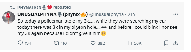 “So today a policeman stole my 3k….. while they were searching my car today there was 3k in my pigeon hole…. and before I could blink I nor see my 3k again because I didn’t give it him.”