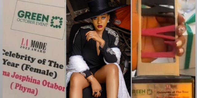BBNaija ‘Level Up’ winner, Phyna is riding high on a wave of excitement and gratitude after being bestowed with the coveted title of “Celebrity of the Year” at the prestigious La Mode Green October event.