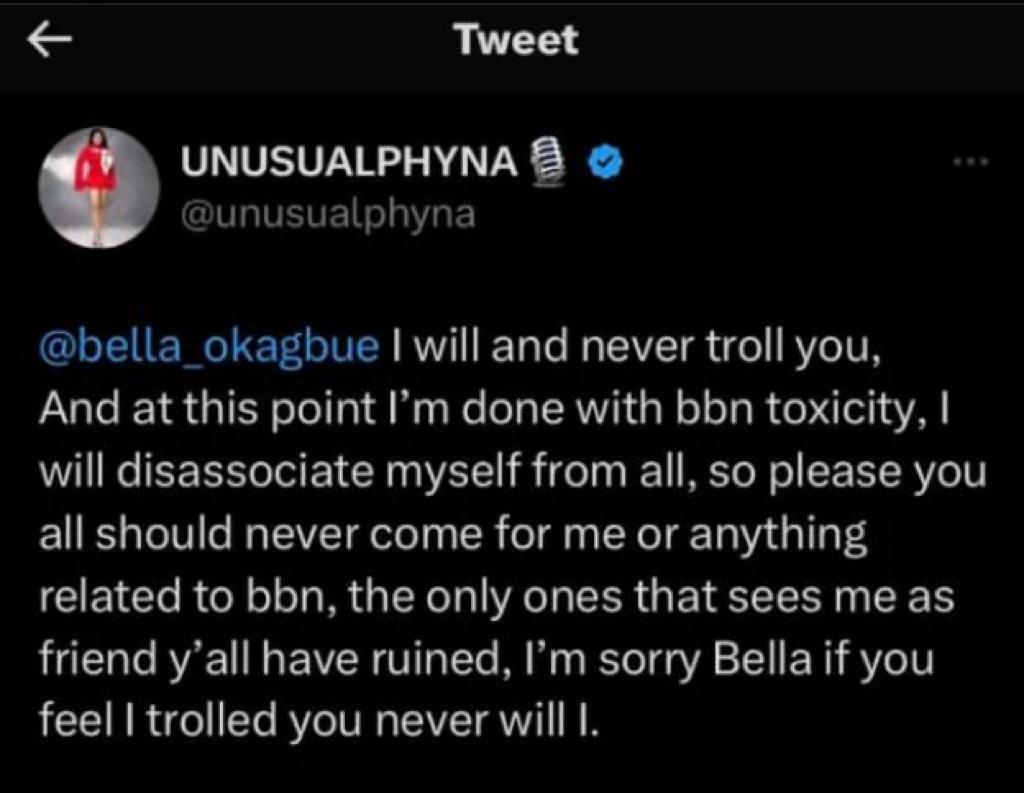 “@bella_okagbue I will and never troll you, And at this point, I’m done with bbn toxicity, I will disassociate myself from all, so please you all should never come for me or anything related to bbn, the only ones that sees me as friend y’all have ruined, I’m sorry Bella if you feel I trolled you never will I.”
