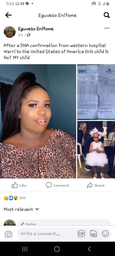 A heartbroken man identified as Eguveso Enifome has revealed that he’s not the biological father of his daughter who’s 7 years old after a DNA test has been conducted.