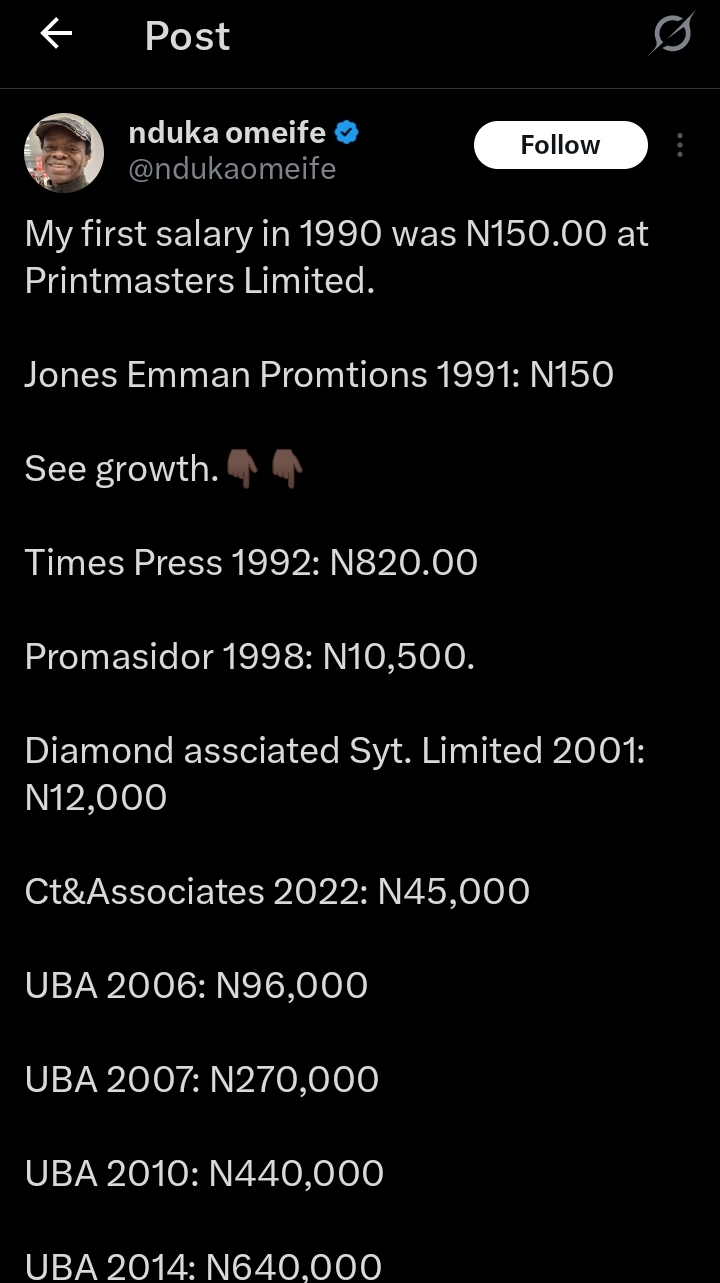 Taking a trip down memory lane, the X user disclosed that his first salary was in 1990 at Prime Masters Limited, followed by Jones Emmanuel Promotions in 1991, where he was paid ₦150 monthly.