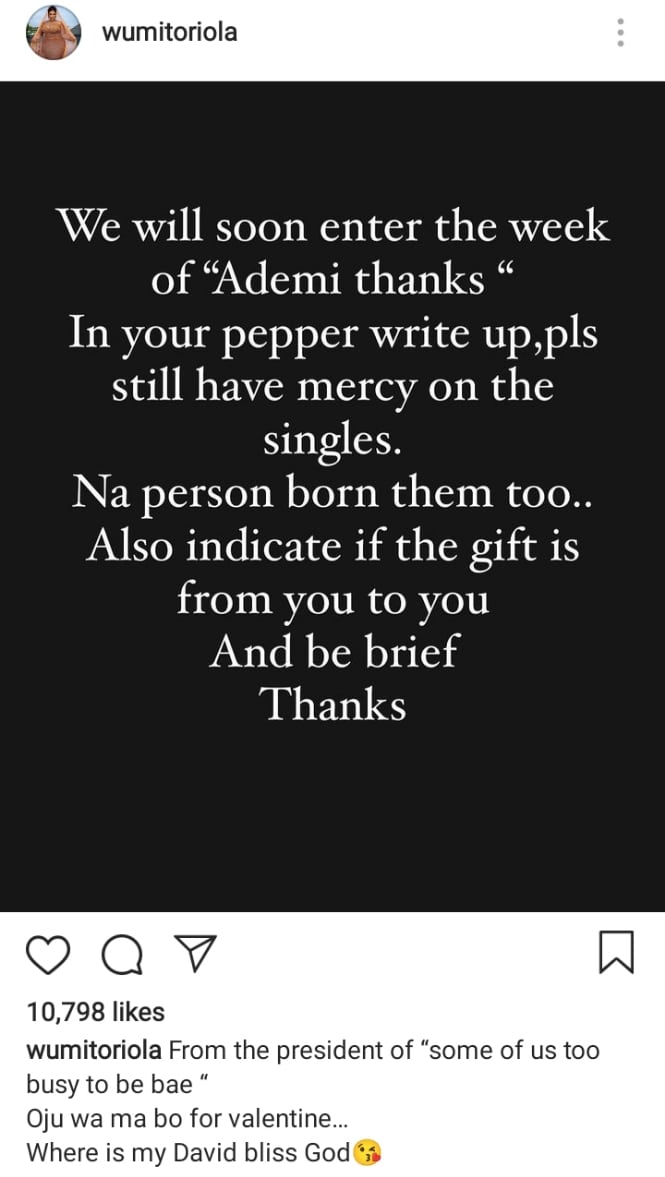 Her post reads: “We will soon enter the week of “Ademi thanks “ In your pepper write up,pls still have mercy on the singles. Na person born them too.. Also indicate if the gift is from you to you. And be brief Thanks.”