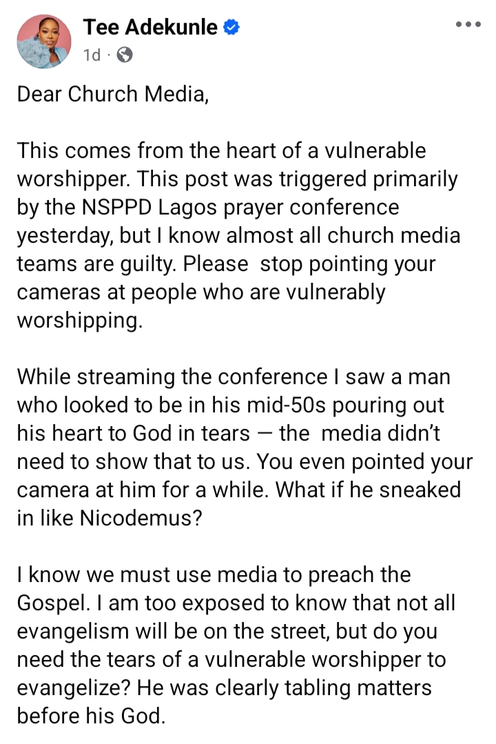 In a Facebook post, Triumph said her appeal was made from a place of vulnerability and was triggered by what she observed while streaming the just-concluded NSPPD Prayer Conference in Lagos. She noted that many church media teams are guilty of similar actions.