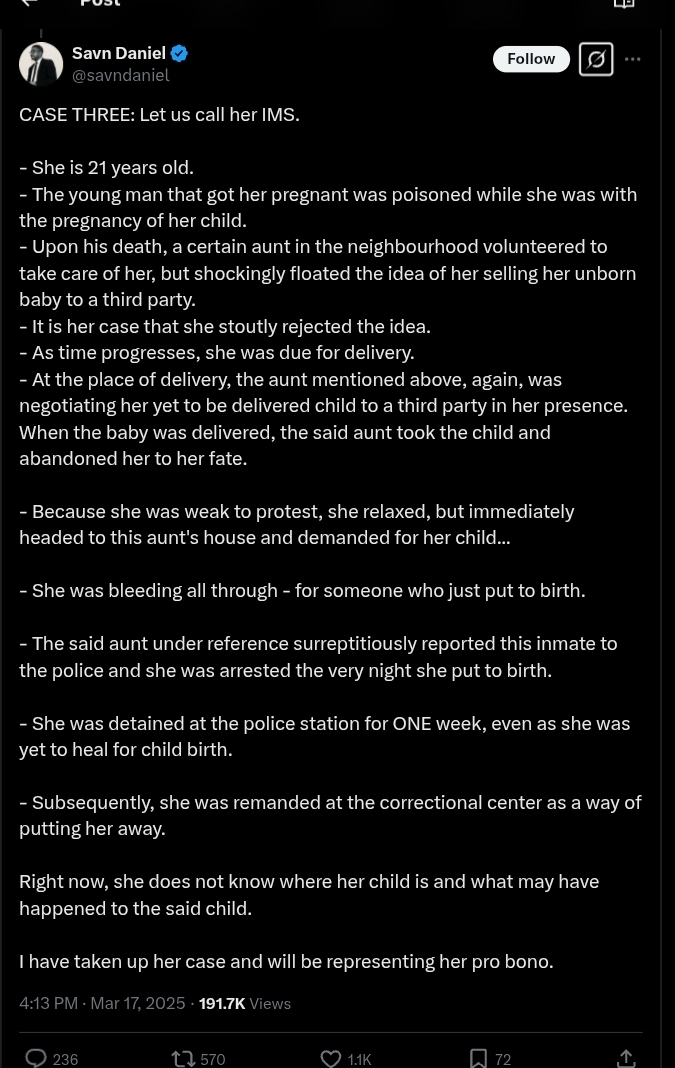 This was revealed in a post shared on X (formerly Twitter) by a lawyer who had visited a correctional facility to offer free legal aid to inmates. During his visit, he encountered a 21-year-old woman who shared her ordeal.