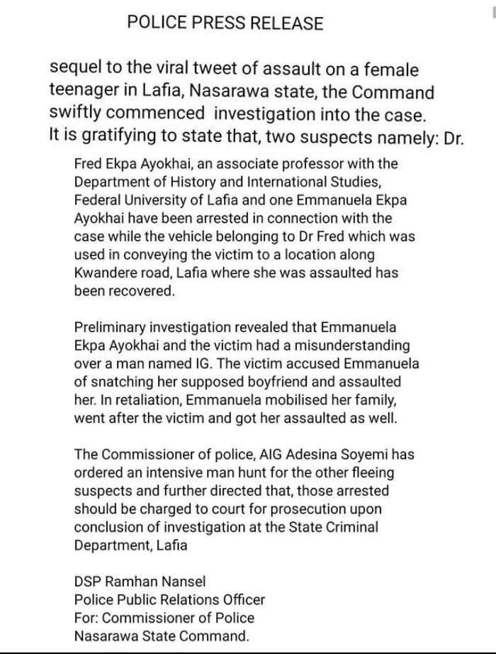 Sequel to the viral tweet of assault on a female teenager in Lafia, Nasarawa state, the Command swiftly commenced investigation into the case. It is gratifying to state that, two suspects namely: Dr. Fred Ekpa Ayokhai, an associate professor with the Department of History and International Studies, Federal University of Lafia and one Emmanuela Ekpa Ayokhai have been arrested in connection with the case while the vehicle belonging to Dr Fred which was used in conveying the victim to a location along Kwandere road, Lafia where she was assaulted has been recovered.