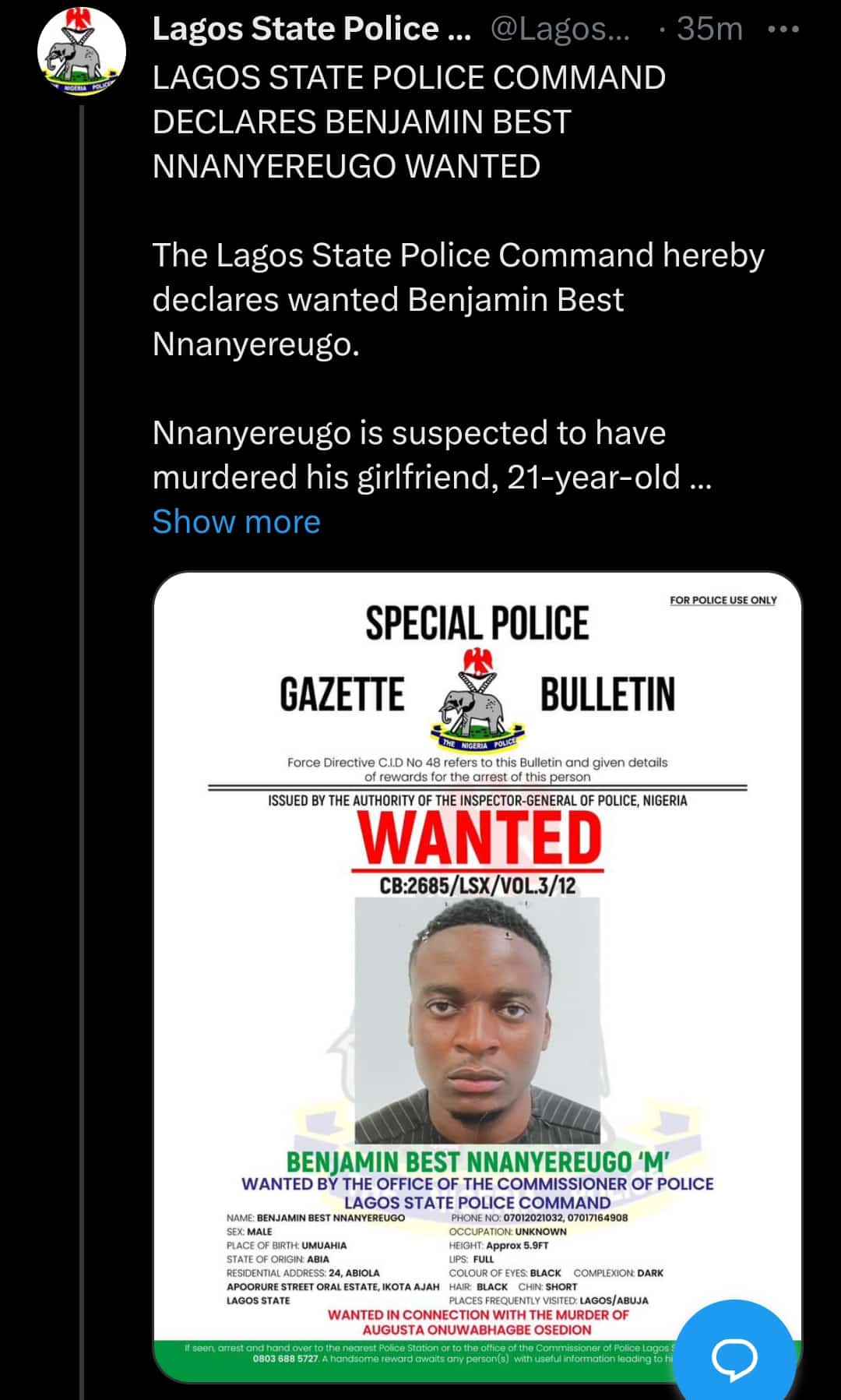 The police statement reads, “The Lagos State Police Command hereby declares Benjamin Best Nnanyereugo wanted.