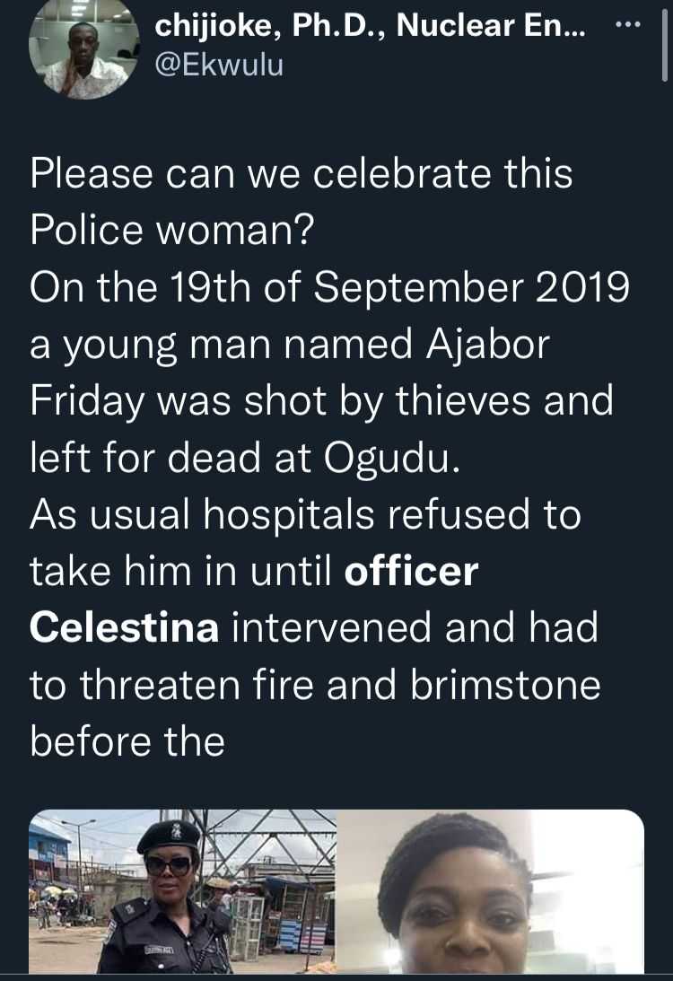 According to a write-up shared by a Twitter user, @Ekwulu, the female officer in question took a robbery victim to the hospital after being shot.