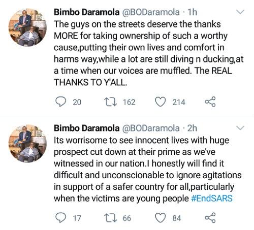 Taking to his own Twitter page, Mr. Bimbo who was once a House of Reps member wrote, “Its worrisome to see innocent lives with huge prospect cut down at their prime as we’ve witnessed in our nation.I honestly will find it difficult and unconscionable to ignore agitations in support of a safer country for all,particularly when the victims are young people #EndSARS”