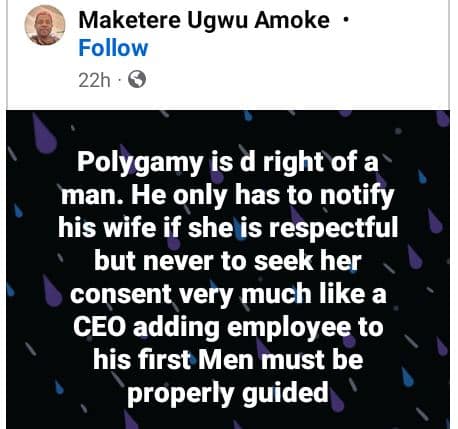 “Polygamy is d right of a man. He only has to notify his wife if she is respectful but never to seek her consent very much like a CEO adding employee to his first Men must be properly guided,” he wrote.