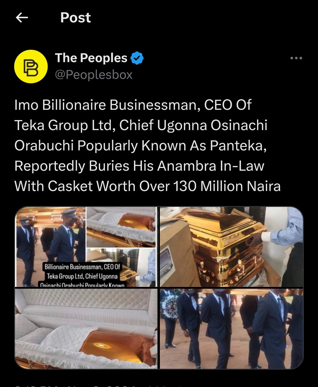 The post reads: “Imo Billionaire Businessman, CEO of Teka Group Ltd, Chief Ugonna Osinachi Orabuchi, popularly known as Panteka, reportedly buries his Anambra in-law in a casket worth over 130 million naira.”