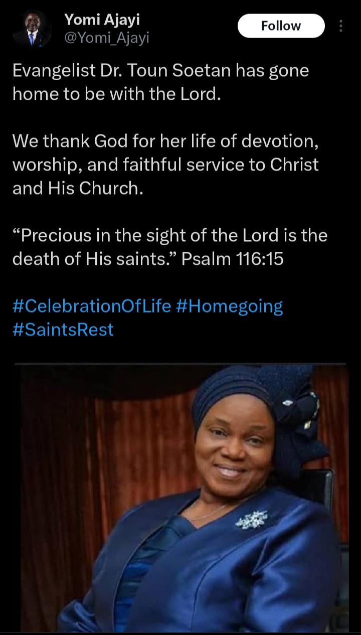 “This is to announce the home calling of our loving mother, Evangelist Rachel Olatoun Soetan. This call to glory occurred this morning, Friday, 13 March 2026. Let us all commiserate with Daddy Soetan and the entire family.”