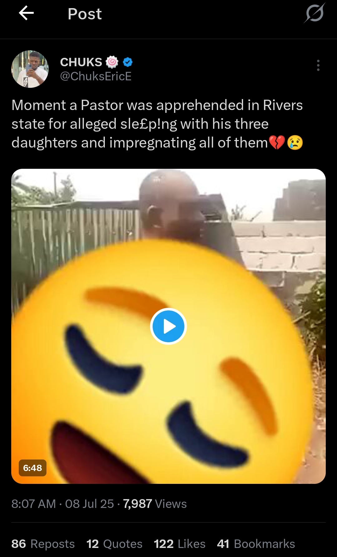 The post includes a video showing the face of the pastor, who is said to be the biological father of the three girls involved.