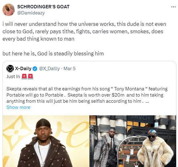 “I will never understand how the universe works, this dude is not even close to God, rarely pays tithe, fights, carries women, smokes, does every bad thing known to man. but here he is, God is steadily blessing him.”
