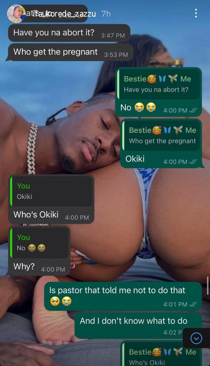 In the chat, the lady confirmed to her lover that she was pregnant and would not be aborting it while stating that he belonged to ‘Okiki Portable.’