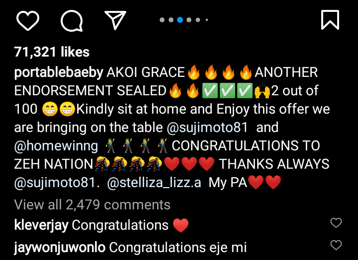 Announcing his latest deal via his Instagram channel, the singer wrote: “AKOI GRACE. ANOTHER. ENDORSEMENT SEALED ✓✓✓2 out of 100 Kindly sit at home and Enjoy this offer we are bringing on the table @sujimoto81 and @homewinng CONGRATULATIONS TO ZEH NATIONAR THANKS ALWAYS.”