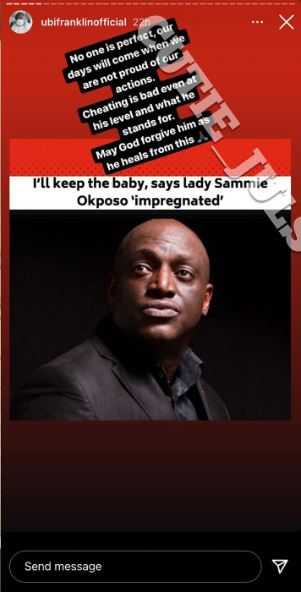 Taking to his Instagram story, Ubi Franklin condemned the act of cheating while praying that God forgives Sammie Okposo owing to this act of infidelity.