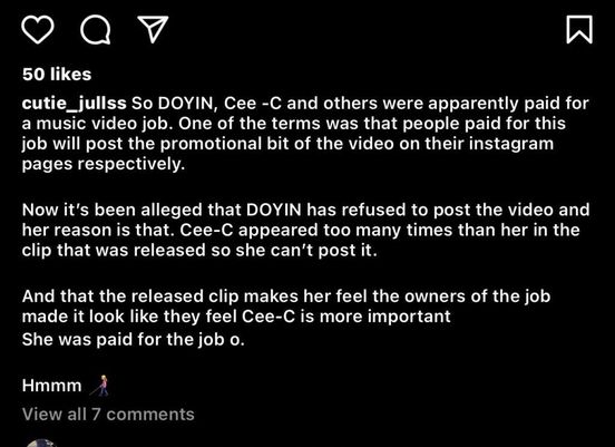 According to the Instagram blogger, Doyin refused to share the video on her page with the excuse that the video captured Ceec more than her making her feel sidelined.